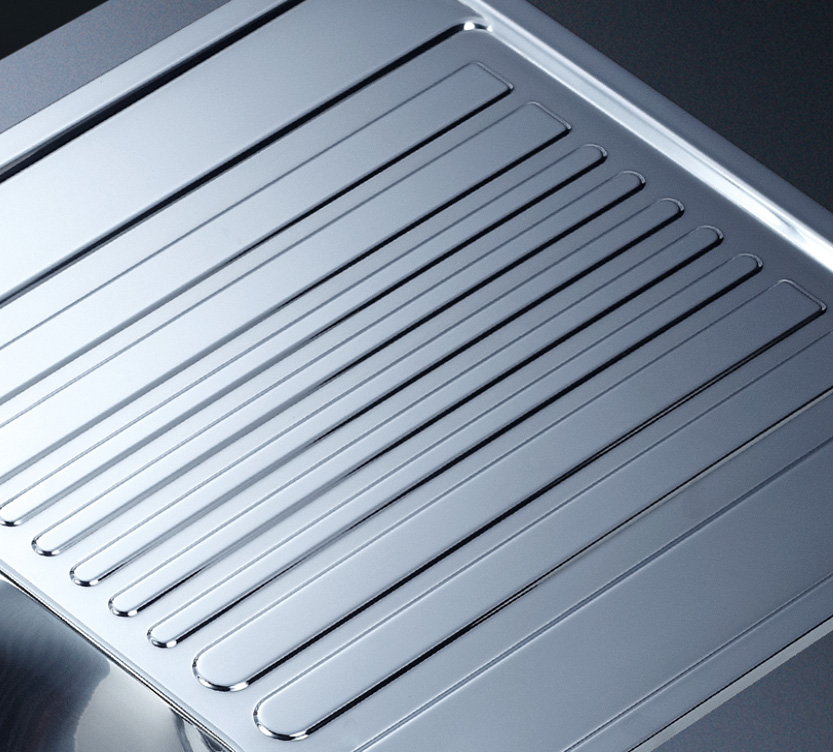 水槽四邊條采用一次成型的折彎加強筋工藝,雙倍堅固,承重力更強,解決了普通焊接工藝容易出現的凹點、脫焊、易割手等問題。專業配置的密封條和固定夾,安裝平整度高,不滲水,不松動