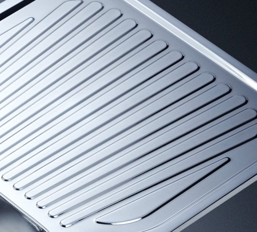 阿發(fā)水槽立邊采用國(guó)際先進(jìn)的10-25°小R角一次成型拉伸技術(shù),更具立體感與時(shí)尚潮流,亦能充分?jǐn)U展水槽利用空間;一次成型拉伸技術(shù),杜絕了焊接工藝易產(chǎn)生的水槽生銹,脫焊事故,充分保障水槽50年以上的使用壽命